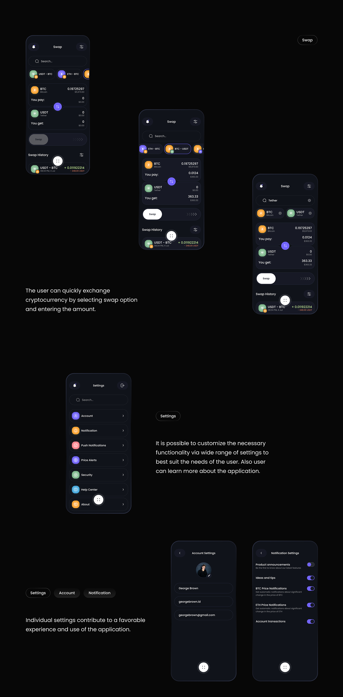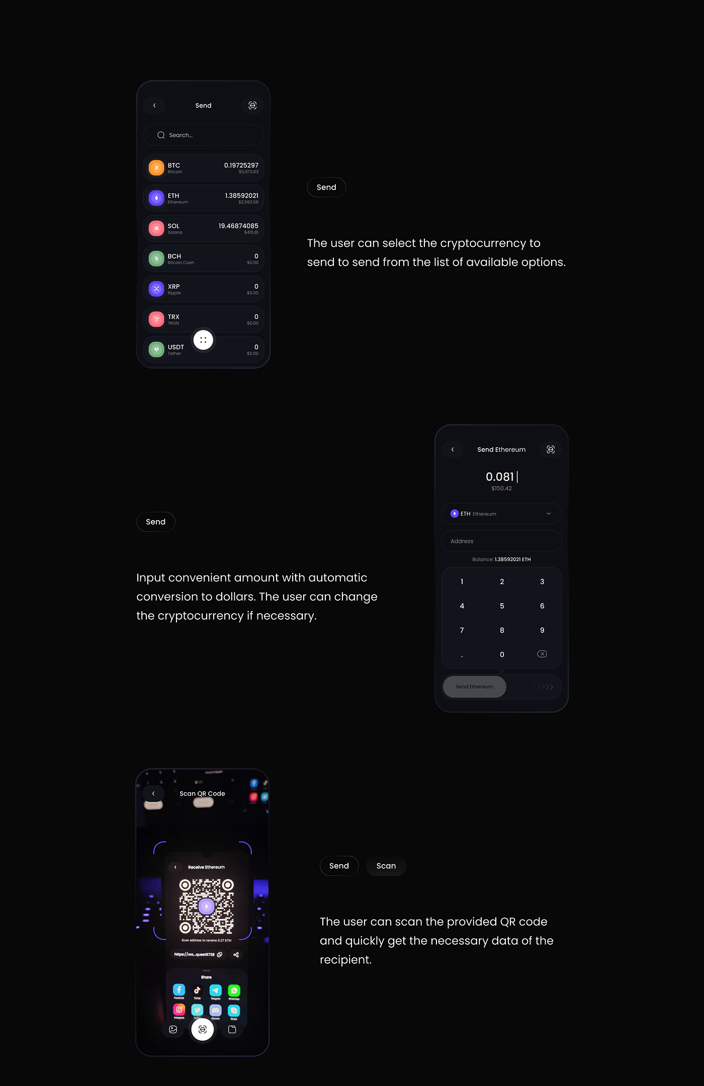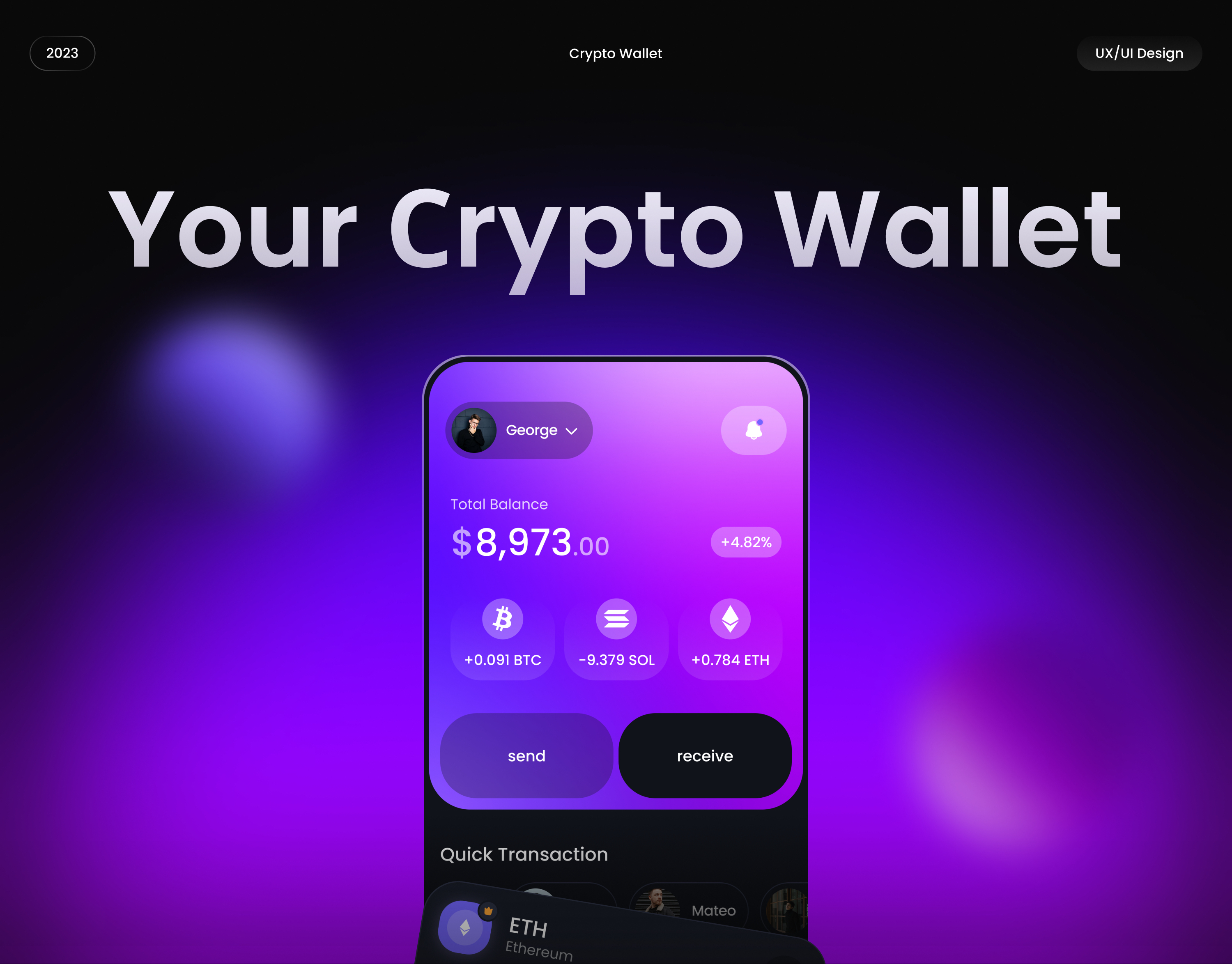 Our project is dedicated to crafting a cutting-edge crypto wallet that provides users with a seamless and secure experience in managing their digital assets. The product design places a strong emphasis on being both practical and visually appealing, ensuring an intuitive and aesthetically pleasing interface. The UI is meticulously designed with a minimalist and intuitive approach, featuring a clean layout that prioritizes essential information. Intuitive icons, clear transaction histories, and straightforward account management contribute to an overall smooth user experience. The UX design is centered around simplicity, security, and efficiency, offering features such as two-factor authentication and real-time market insights.